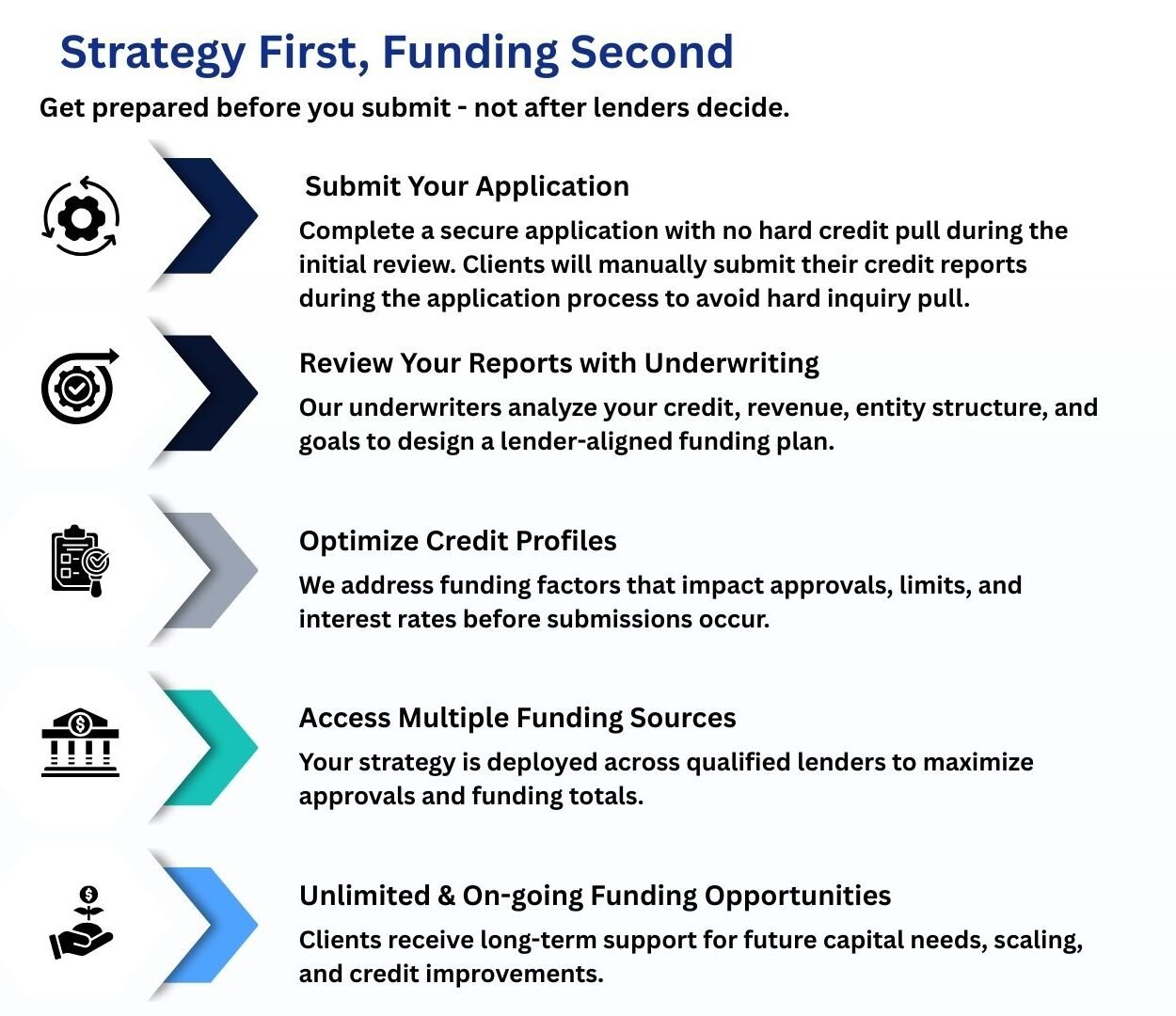 At FundFi, personal funding is approached as part of a broader financial strategy, not a short-term fix. Our process is designed to minimize unnecessary credit damage while maximizing approval potential and borrowing power.
